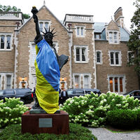 Статуя Свободы с флагом Украины в саду посольства Франции в Вашингтоне, 18 августа 2025 года