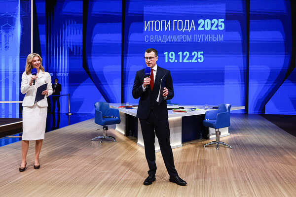 Ведущие «Итогов года» — Павел Зарубин и Екатерина Березовская, они готовятся к началу программы.