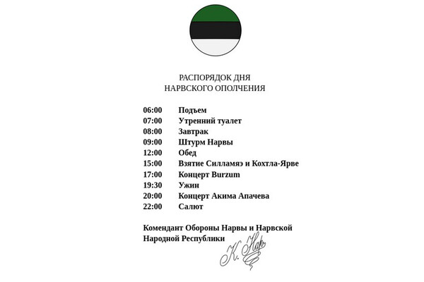 Публиковали и картинки с «распорядком дня нарвского ополчения». В списке — штурм Нарвы в 09:00, взятие соседних городов Силламяэ и Кохтла-Ярве в 15:00, а вечером — «концерт Акима Апачева».
