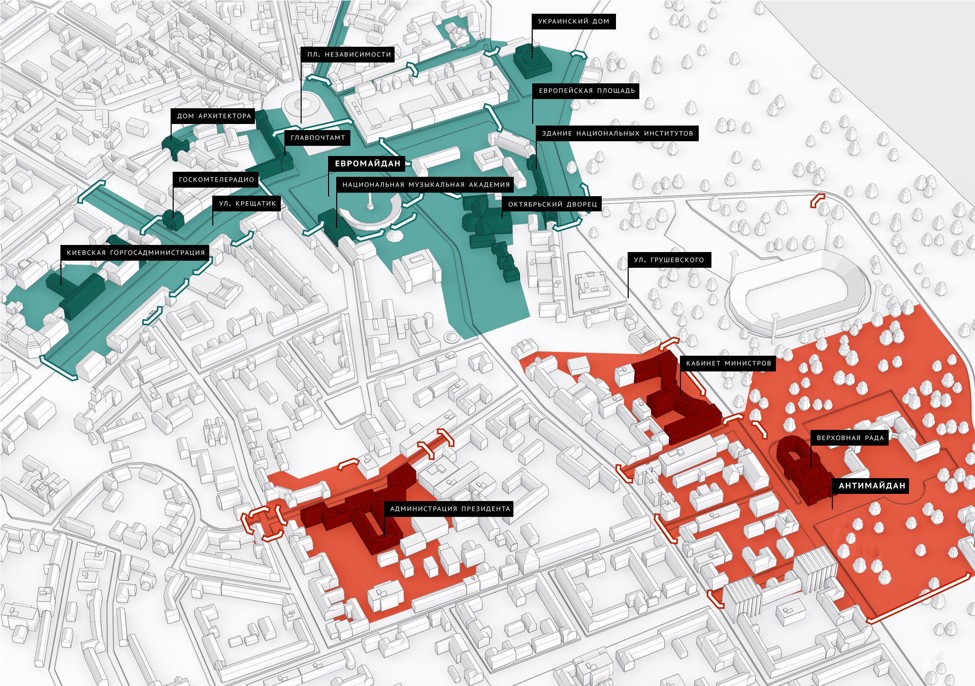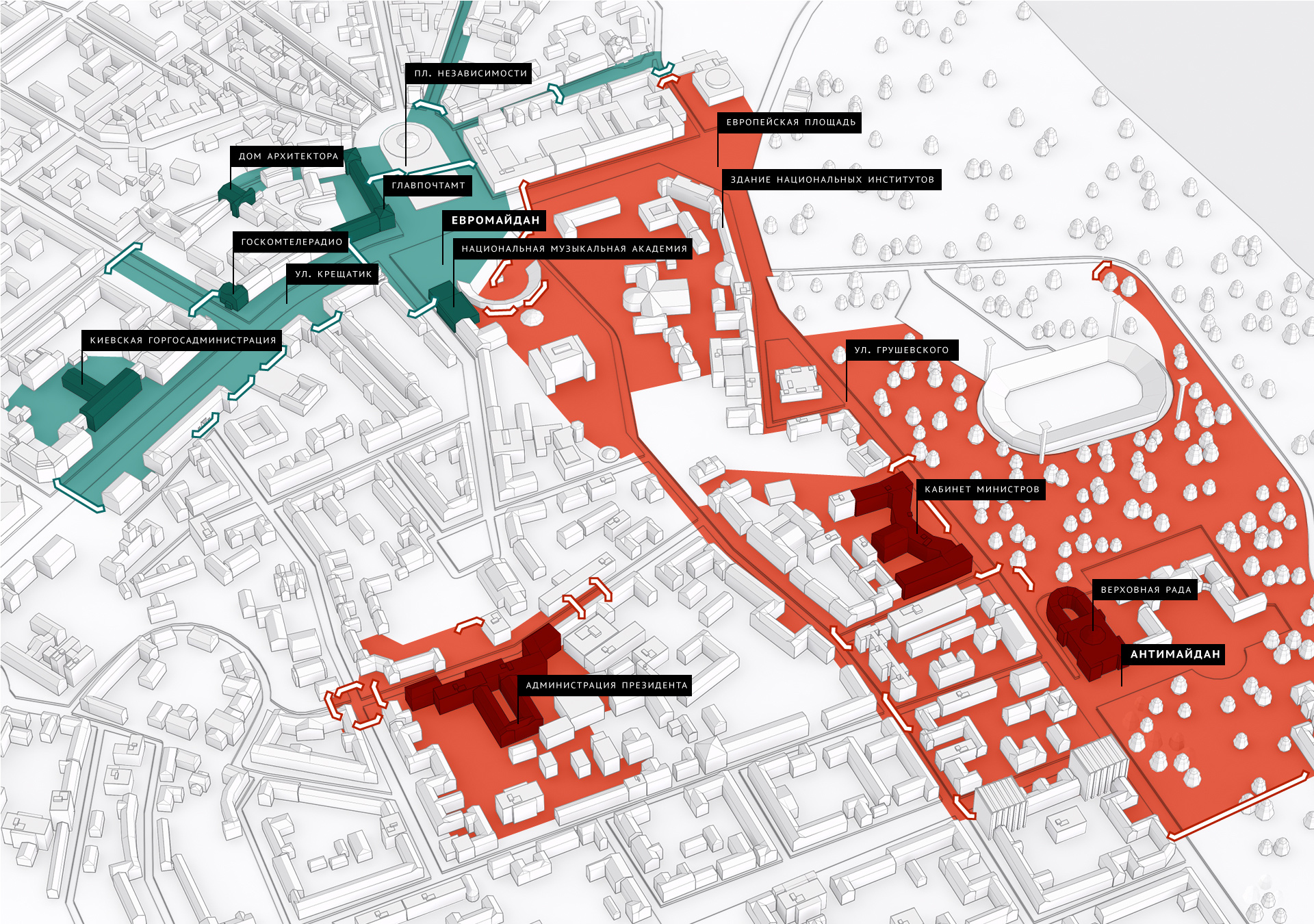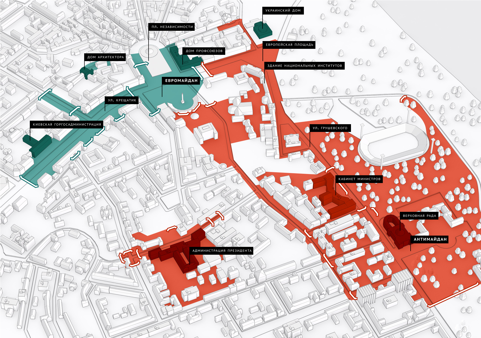 Еще более жестокое противостояние произошло при попытке захвата Администрации президента. Тогда ранили очень многих сотрудников — их избивали, давили трактором. Мы были вынуждены применять шумовые гранаты и резиновые пули, такого никогда не было, но нас избивали прутами, цепями, камнями и жгли коктейлями Молотова.