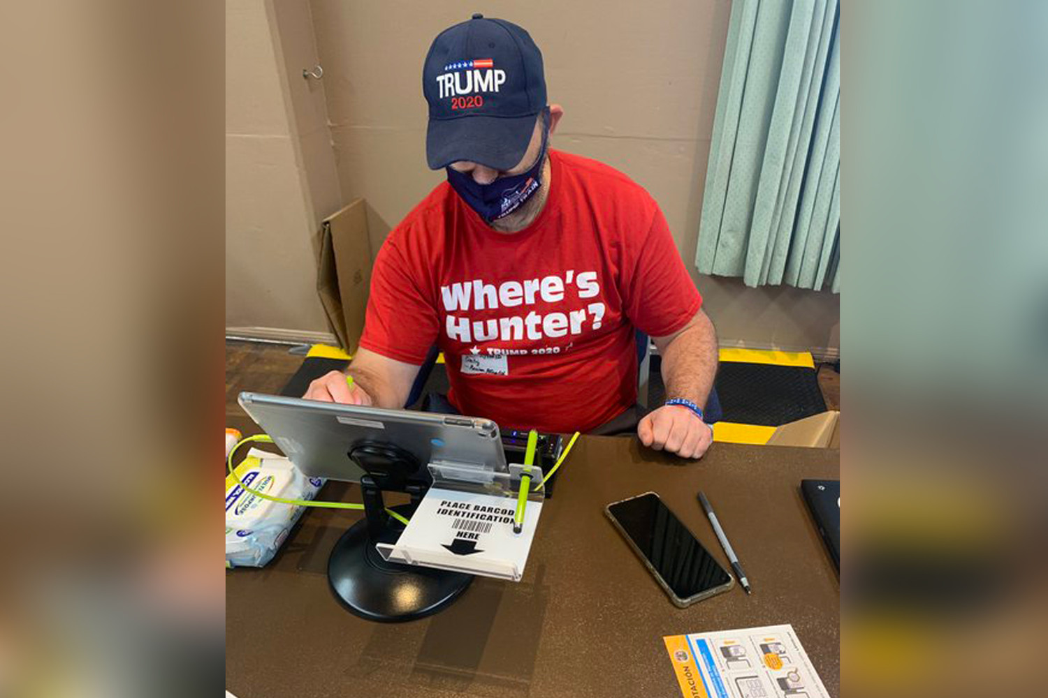 На фотографии было видно, что мужчина одет в кепку «Трамп 2020» и футболку с надписью: «Где Хантер» и «Трамп 2020». В этот момент он сидел за ноутбуком.