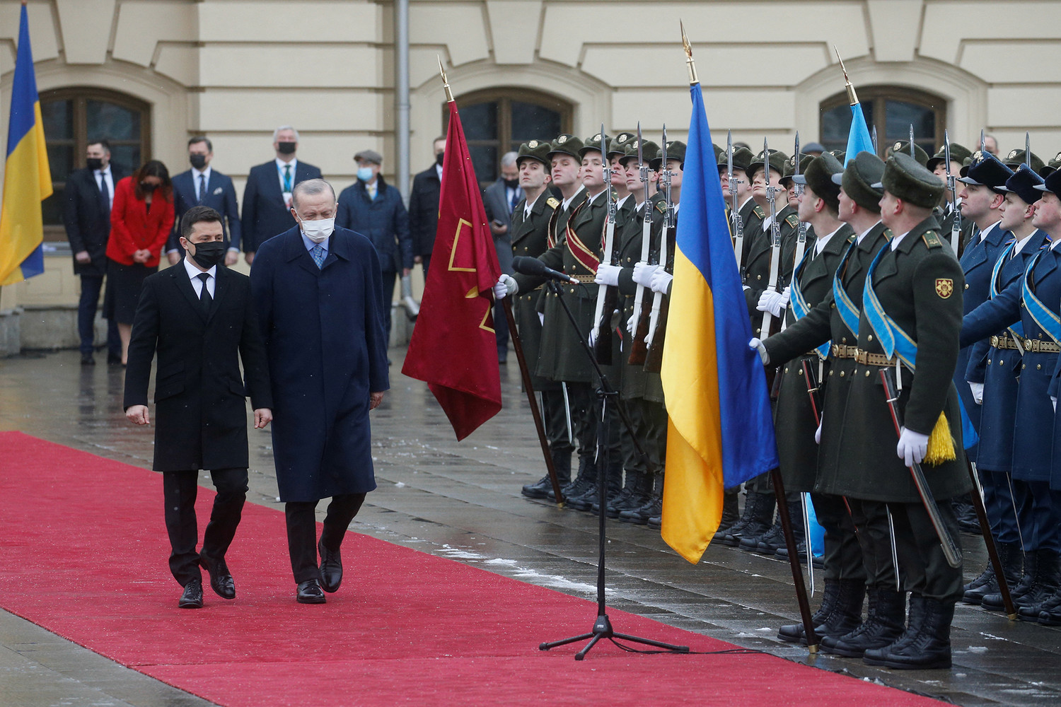 На опубликованных кадрах видно, как Эрдоган и президент Украины Владимир Зеленский выходят из Мариинского дворца в Киеве, где их встречает почетный караул. После чего президент Турции обращается к военным с приветствием: «Слава Украине!». Почетный караул в ответ скандирует: «Героям слава!»
