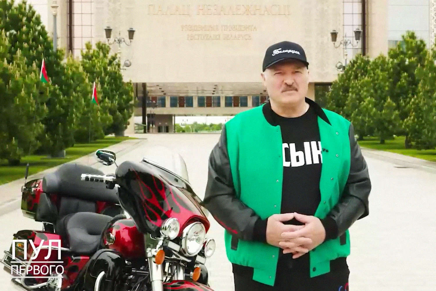 Президент Белоруссии Александр Лукашенко поздравил выпускников в футболке с надписью «сын» на фоне мотоцикла.