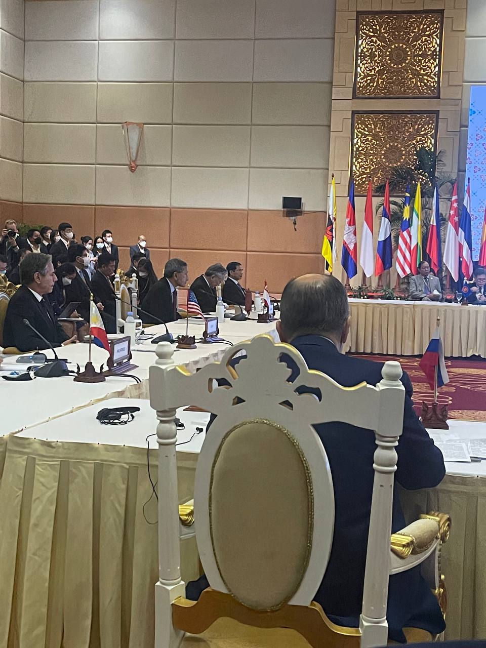 Официальный представитель МИД России Мария Захарова в своем Telegram-канале опубликовала фотографию, на которой одновременно запечатлены министр иностранных дел России Сергей Лавров и госсекретарь США Энтони Блинкен, которые присутствуют на саммите АСЕАН.