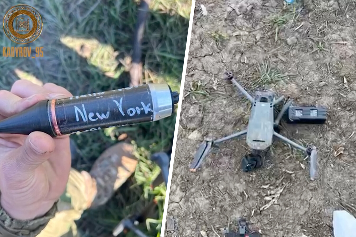 Глава Чечни Рамзан Кадыров опубликовал в своем Telegram-канале видео, на котором показан квадрокоптер, подбитый чеченскими бойцами, с надписью на боевом снаряде на английском «Привет из Нью-Йорка».