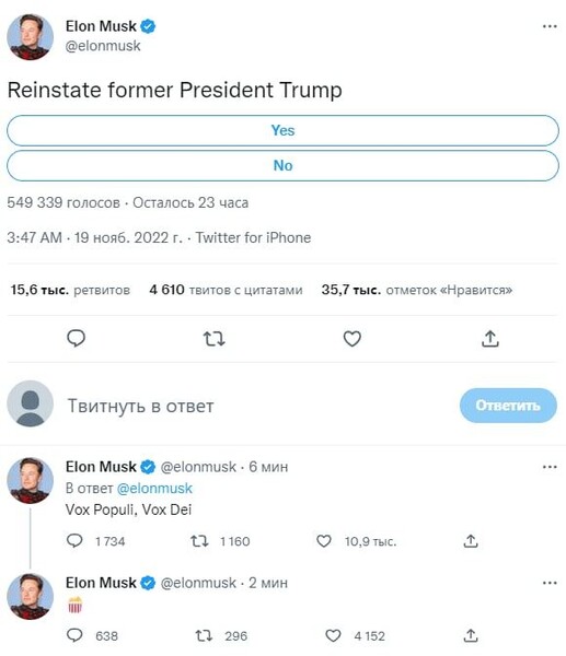 Ранее предприниматель и владелец Twitter Илон Маск сообщил, что опрос о возвращении аккаунта экс-президента США Дональда Трампа в социальной сети поможет доработать систему голосования.