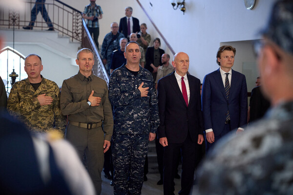 Как следует из текста, во время переговоров Владимира Зеленского, Рустема Умерова и Джона Хили в Одессе прозвучала воздушная тревога, после чего им пришлось укрыться в подвальном помещении. По данным газеты, покинуть убежище им удалось не менее, чем через полчаса.