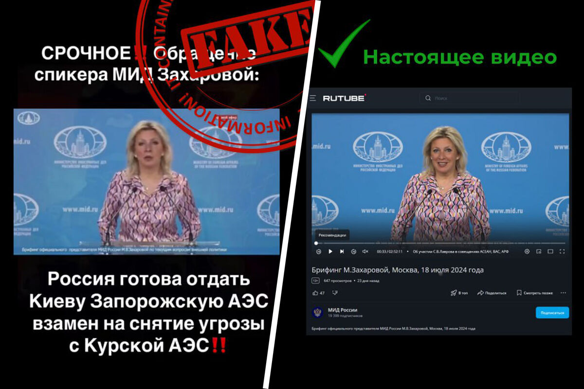 По данным министерства, спецслужбы Украины при содействии Запада используют технологии «дипфейк» и искусственного интеллекта для того, чтобы распространять ложную информацию о ситуации в приграничных регионах России. Так, накануне в сеть попало фальшивое видео, на котором Захарова якобы предлагает передать Украине ЗАЭС в обмен на вывод украинских войск с территории Курской области.