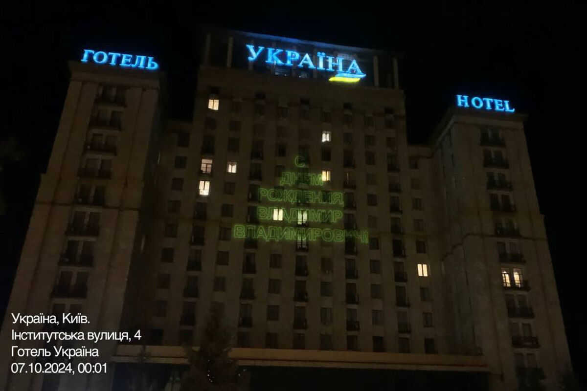 В центре Киева с помощью лазерного проектора на здании отеля «Украина» вывели надпись «С Днем рождения, Владимир Владимирович». Об этом сообщает ТВЦ.