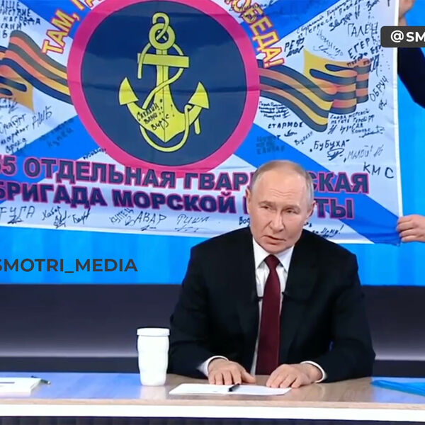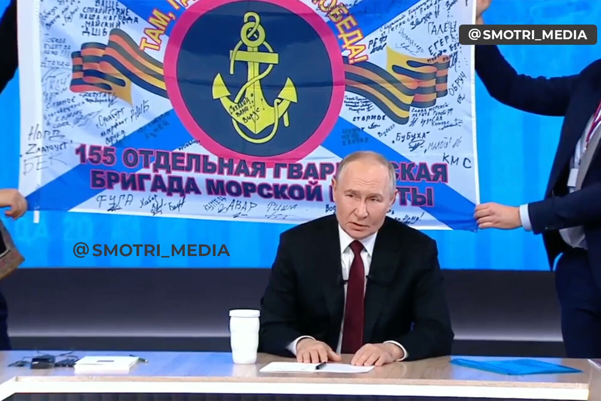 Также Путин рассказал, что регулярно общается с российскими военнослужащими, которые участвуют в спецоперации. Он также показал знамя 155-й бригады морской пехоты, которое ему подарили.