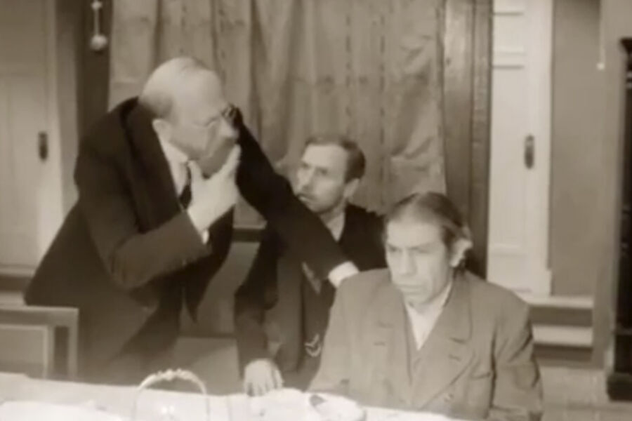 В фрагменте профессор Филипп Преображенский в присутствии доктора Ивана Борменталя отчитывает Полиграфа Шарикова, говоря, что тот стоит на самой низкой ступени развития.