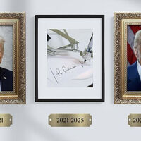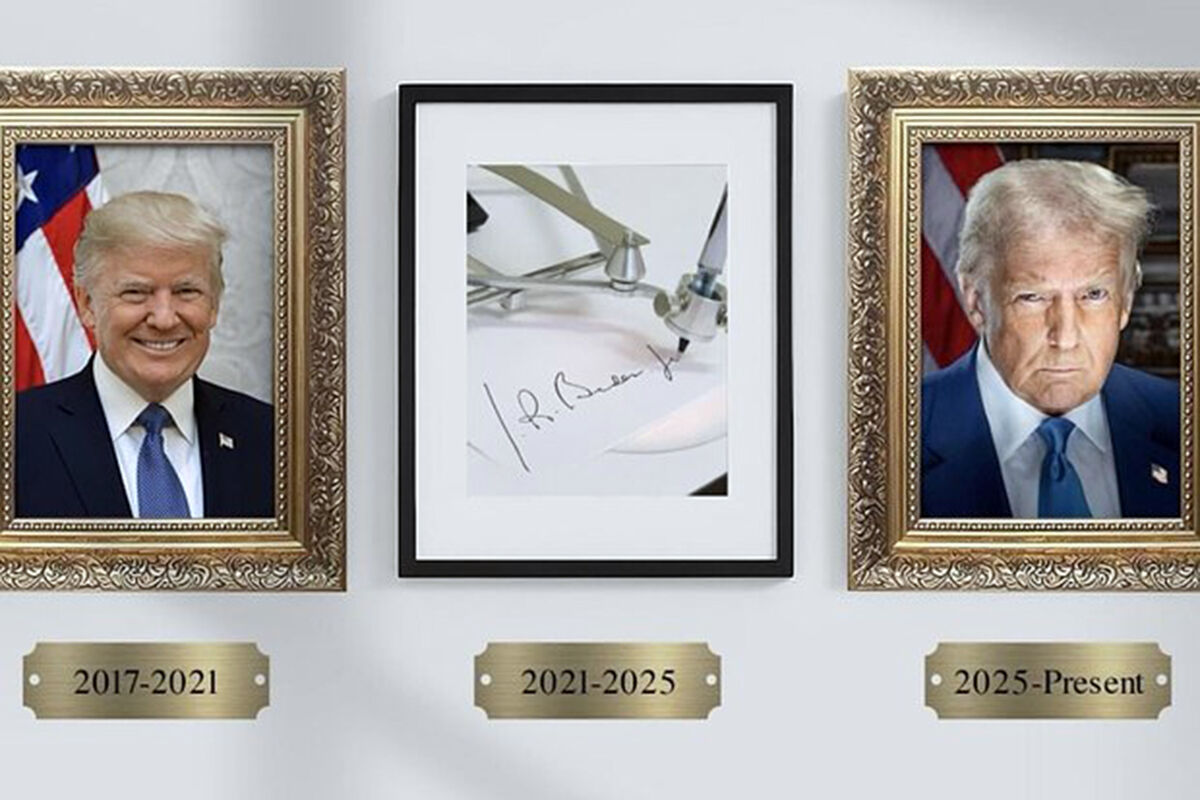 На картинке изображена стена с тремя фотоснимками. На первом запечатлен официальный портрет Трампа во время первого президентского срока, на третьем – его фотография перед вступлением в должность во второй раз. Между фотографиями Трампа расположилась фотография машинки, которая выводит подпись Байдена на бумаге.