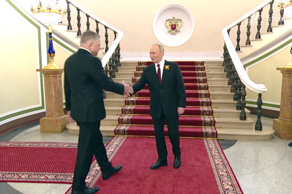 На лацкане пиджака у Путина — георгиевская лента.