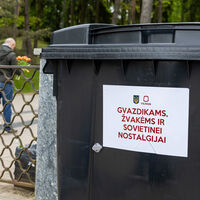 Власти Вильнюса установили мусорный бак на месте возложения цветов в память о победе в Великой Отечественной войне. На мусорном баке красными буквами на белом фоне написано: «Для гвоздик, свечей и советской ностальгии». Помимо надписи, на контейнере также изображен герб Украины. Рядом с баком стоит мусороуборочная машина с такими же изображениями и текстом.