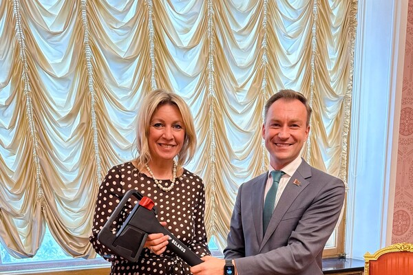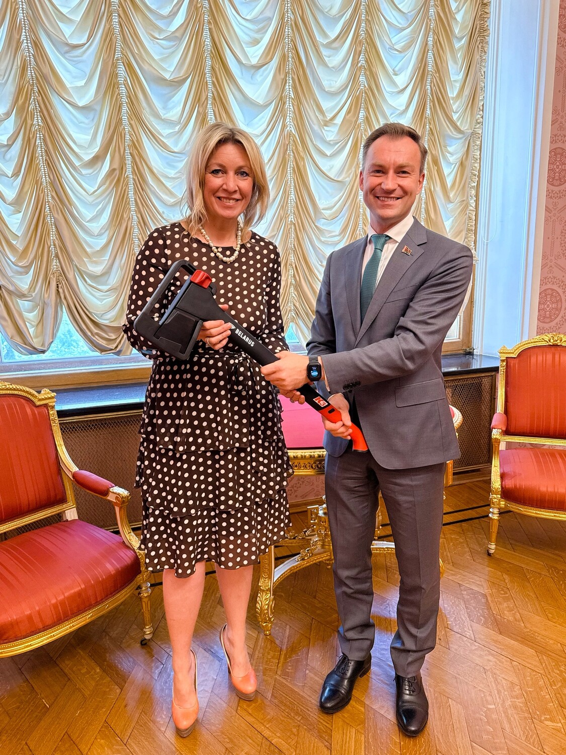 В своем Telegram-канале Мария Захарова рассказала, что глава управления информации и цифровой дипломатии МИД Белоруссии Варанков подарил ей топор.
