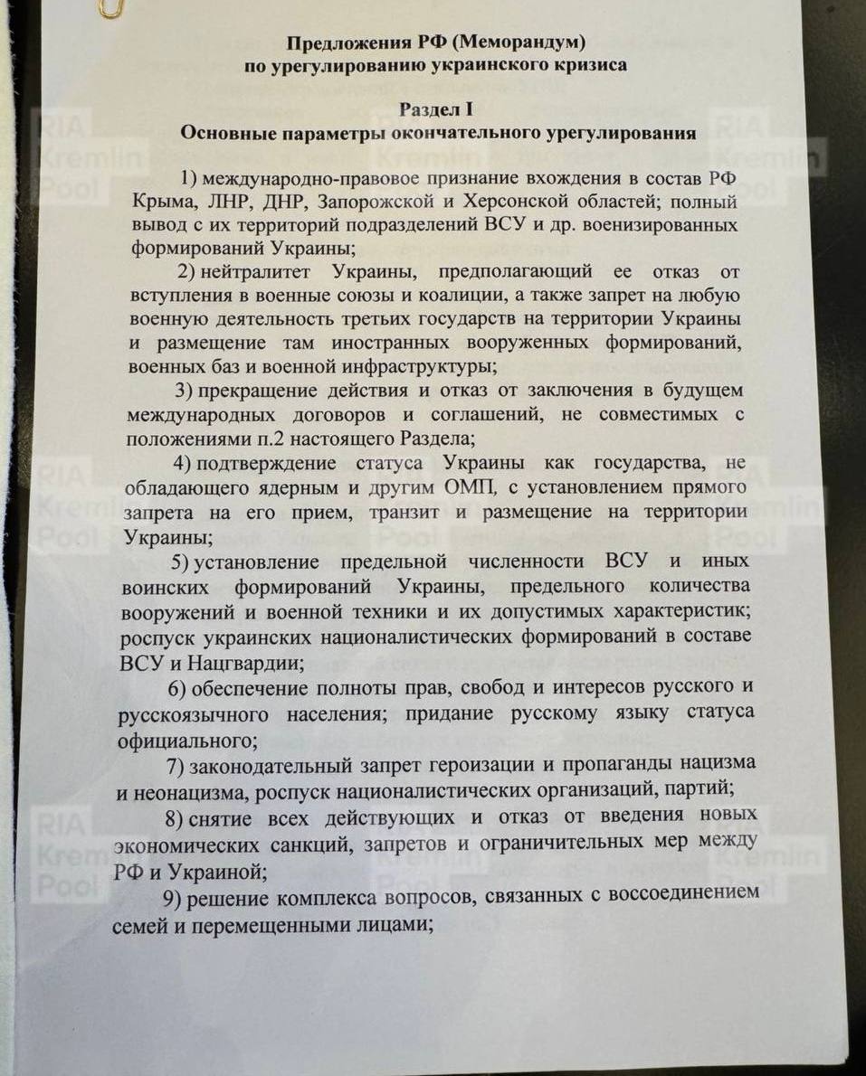 В сети опубликовали полный текст российского меморандума по урегулированию конфликта с Украиной, который был передан Киеву в рамках переговоров в Стамбуле 2 июня. Об этом сообщает РИА Новости.
