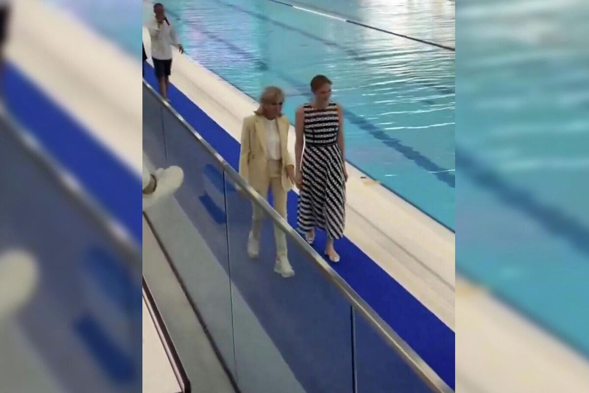 Филиппо также опубликовал ролик, на котором видно, как первая леди Франции вместе с княгиней Шарлен идут вдоль бортика бассейна. Брижит Макрон была одета в белые кроссовки.