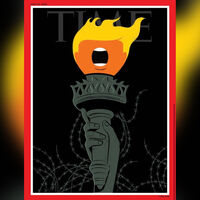 На картинке изображен факел в руке Статуи Свободы. В огне отчетливо прослеживается лицо Трампа с открытым ртом и его характерная прическа. Руку, держащую факел, обвивает колючая железная проволока, которую обычно можно увидеть на границах государств.