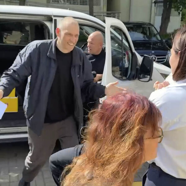 На видео мужчина выходит из белого микроавтобуса под аплодисменты. Его обнимает Светлана Тихановская.