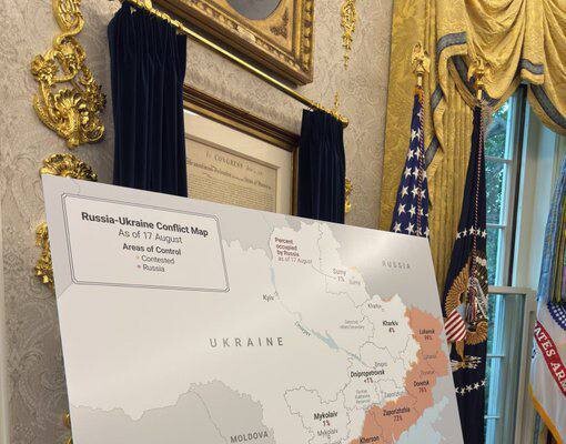 18 августа во время встречи Трампа и Зеленского в Овальном кабинете была развернута карта Украины. По данным Би-би-си, восточная часть территории страны, которую в настоящий момент контролируют ВС России, оказалась окрашена розовым цветом.