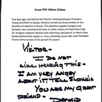 22 августа политический советник премьер-министра Венгрии Балаж Орбан опубликовал фото ответа Трампа на письмо главы венгерского кабмина Виктора Орбана об ударе Украины по нефтепроводу «Дружба». В своей записке президент США заявил, что очень зол из-за произошедшего. При этом глава государства назвал премьера Венгрии «другом».