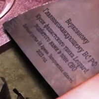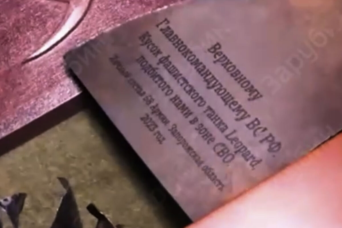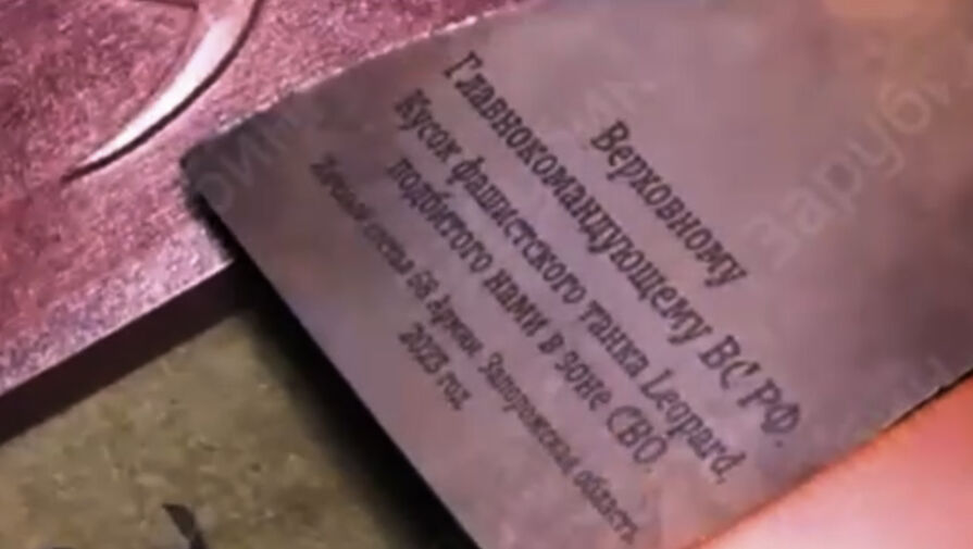 «Верховному главнокомандующему кусок фашистского танка Leopard, подбитого нами в зоне СВО. Личный состав 58-й армии. Запорожская область 2023 год», — написано на нем.