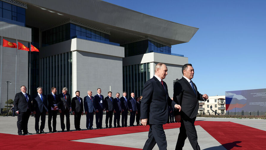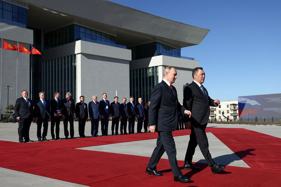 Российский лидер прилетел в Киргизию 25 ноября. У трапа Путина лично встретил Жапаров. В честь прибытия важного гостя в воздушной гавани Бишкека подняли государственные флаги России и Киргизии, уложили красную ковровую дорожку, вдоль которой встал почетный караул. Также вдоль ковровой дорожки установили традиционные юрты.