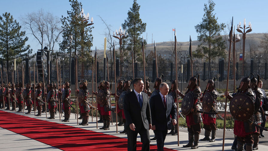 На видео, опубликованном в сети, можно увидеть, что для встречи Путина и президента Киргизии Садыра Жапарова у Дворца единства выстелили красную ковровую дорожку. Вдоль нее выстроился почетный караул, а также киргизские воины, облаченные в костюмы богатырей.