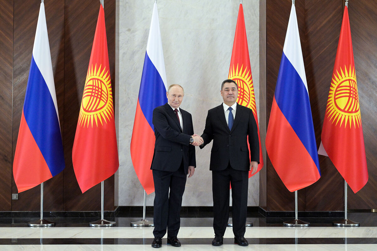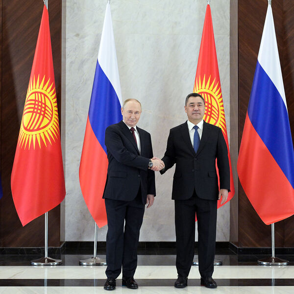 Российский лидер прилетел в Бишкек 25 ноября. У трапа Путина лично встретил Жапаров. В честь прибытия важного гостя в воздушной гавани подняли государственные флаги России и Киргизии, уложили красную ковровую дорожку, вдоль которой встал почетный караул. Также рядом с ней установили традиционные юрты.