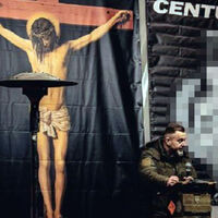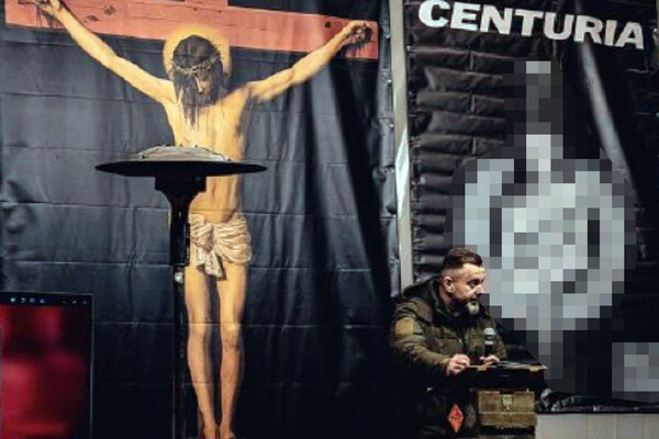 На сцене была расположена репродукция картины Диего Веласкеса «Распятый Христос», а рядом находился плакат «Центурии» с символами палачей Христа - венка, меча и трех щитов римских легионеров, добавила Захарова. С противоположной же стороны была неонацистская атрибутика. По словам Захаровой, в таком «адском антураже» Христос выглядел «распятым заживо».