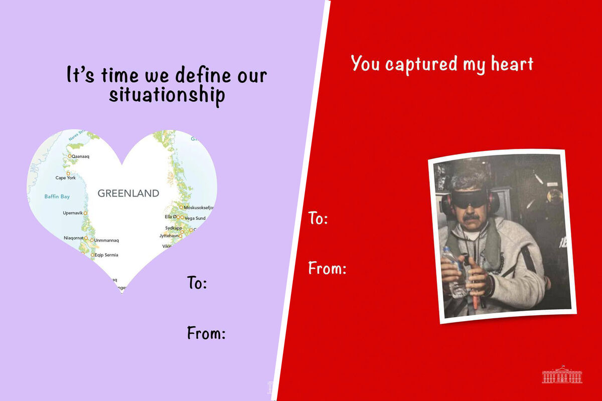 Белый дом 13 февраля опубликовал в социальной сети Х праздничные валентинки в преддверии Дня всех влюбленных с изображением президента Венесуэлы Николаса Мадуро и Гренландии.