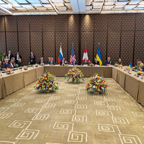 На кадре в центре зала можно увидеть флаги трех стран — участниц переговоров. Это Россия, США и Украина. Четвертый флаг принимающей стороны — Швейцарии. Во главе стола сидит американская делегация, с правой стороны от нее расположилась украинская переговорная группа во главе с секретарем Совета нацбезопасности и обороны Украины Рустемом Умеровым, с левой — российская делегация, которую возглавляет помощник президента РФ Владимир Мединский.
