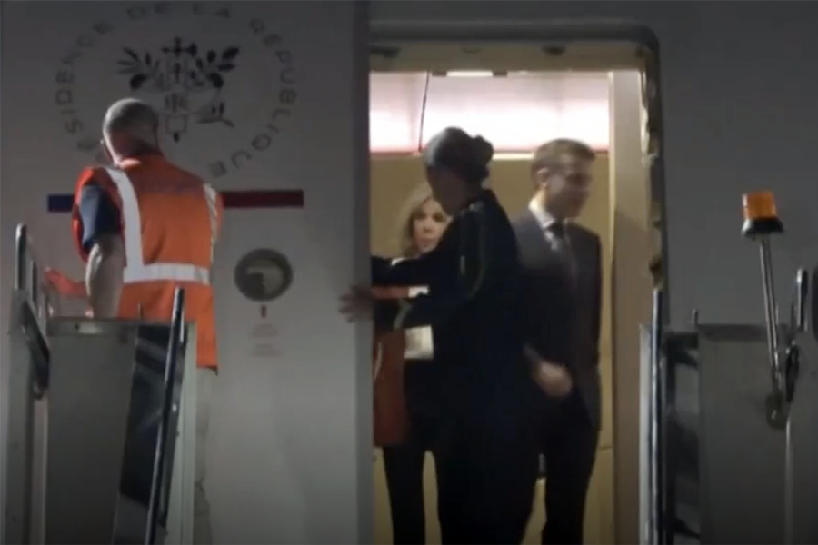 Президент Франции Эммануэль Макрон резко отошел от своей жены Брижит во время выхода из самолета в Индии. Трансляцию вел телеканал BFM2.