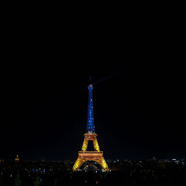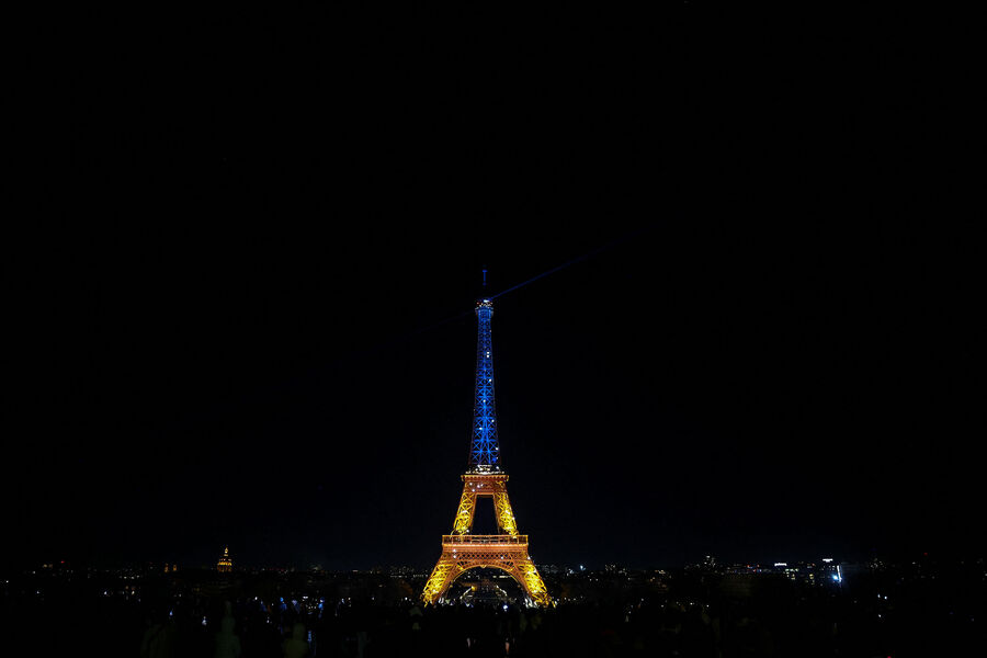 На кадрах с места событий видно, что архитектурная достопримечательность Парижа вечером 24 февраля была подсвечена желтым и синим цветами.