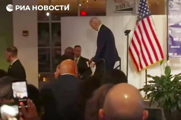 После окончания выступления Байден начал спускаться по лестнице, держась левой рукой за поручень. Правую руку он протянул стоявшему рядом человеку, предположительно помощнику или сотруднику охраны. Тот взял его за руку, приобнял за поясницу и довел до конца лестницы.