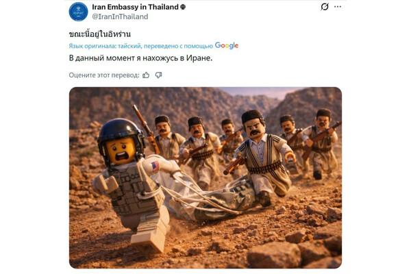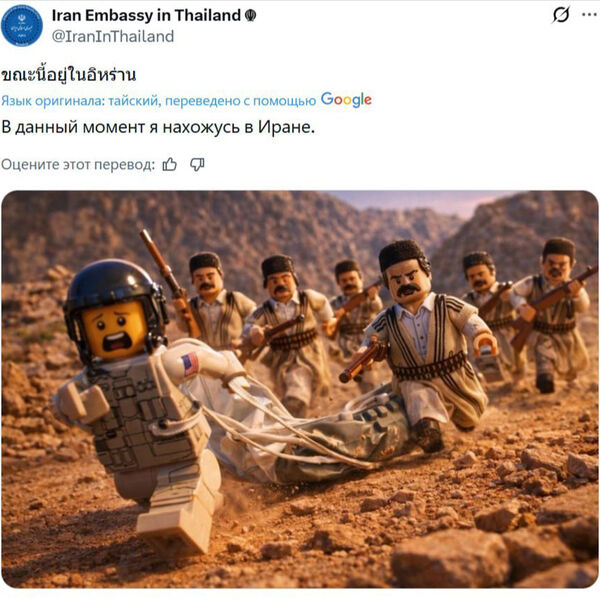 Посольство Ирана в Таиланде после новости о сбитом американском истребителе запостило мем в стиле Lego. Об этом сообщает RT.