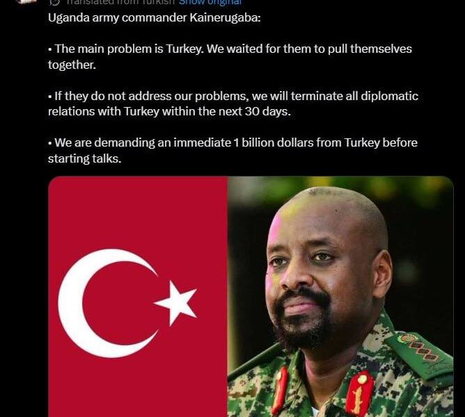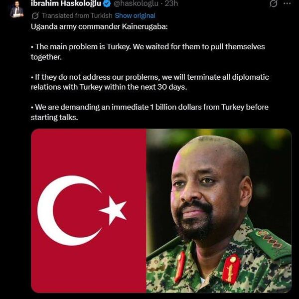 Сын президента Уганды, главнокомандующий армией страны Мухузи Кайнеругаба потребовал от Турции миллиард долларов и самую красивую женщину в жены. Об этом он сообщил в социальной сети Х.
