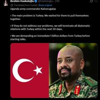 Сын президента Уганды Йовери Мусевени заявил, что у Турции «нет шансов выжить» в войне с Угандой, поскольку на ее стороне «Иисус Христос и Мухаммед Али», а также потребовал от Анкары $1 млрд и отдать ему самую красивую женщину Турции в жены.