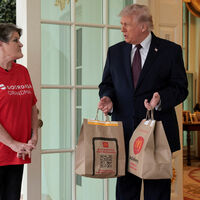 Во время мероприятия на месте появилась женщина в форменной футболке службы доставки еды DoorDash и отдала главе государства два больших пакета сети ресторанов McDonald's.