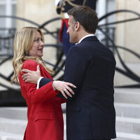 На видео встречи, опубликованном французским СМИ, Макрон внезапно несколько раз крепко обнимает Мелони и целует ее в щеку, вызвав непонимание на ее лице. После этого премьер-министр Италии прошла несколько шагов рядом с президентом Франции и протянула ему руку.