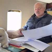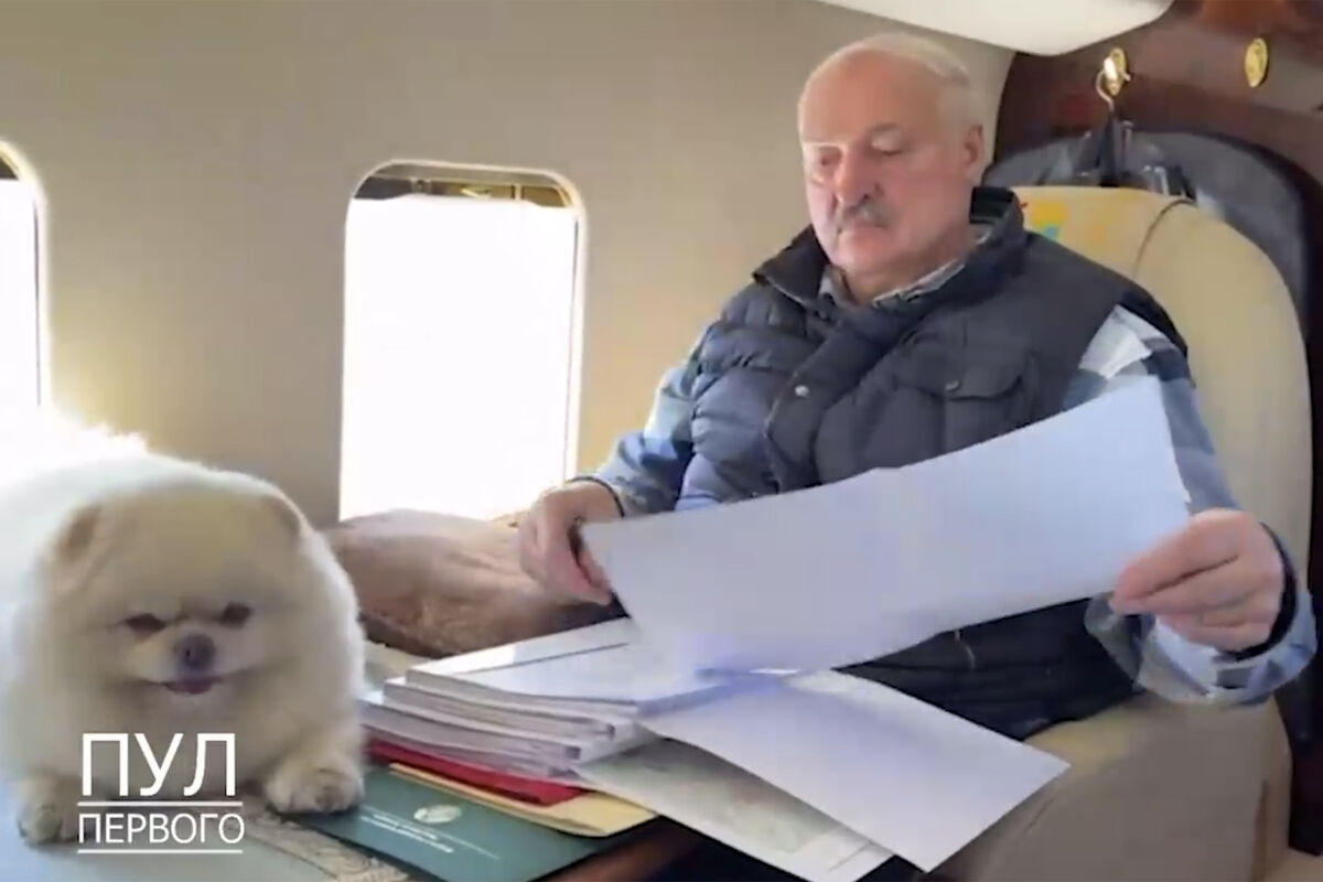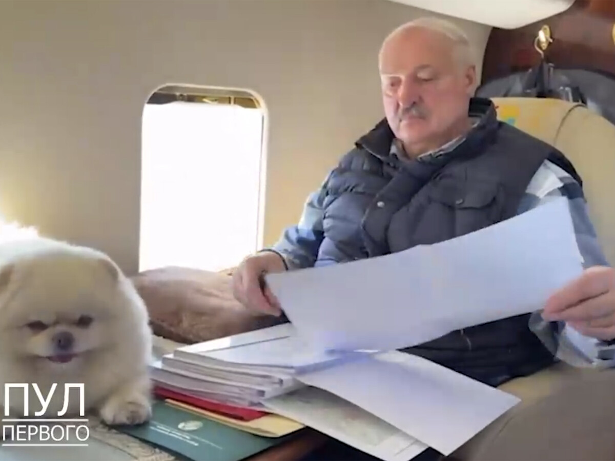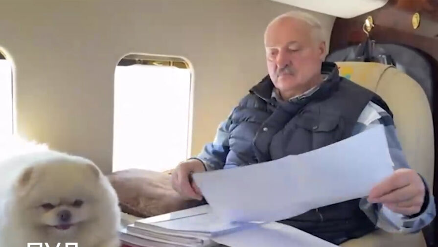 На кадрах Лукашенко вместе со своим питомцем — шпицем по кличке Умка — летит над Минской областью. В то время как глава государства занимается документами, собака находится рядом и внимательно наблюдает за происходящим.