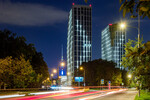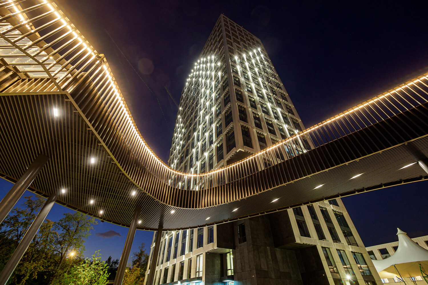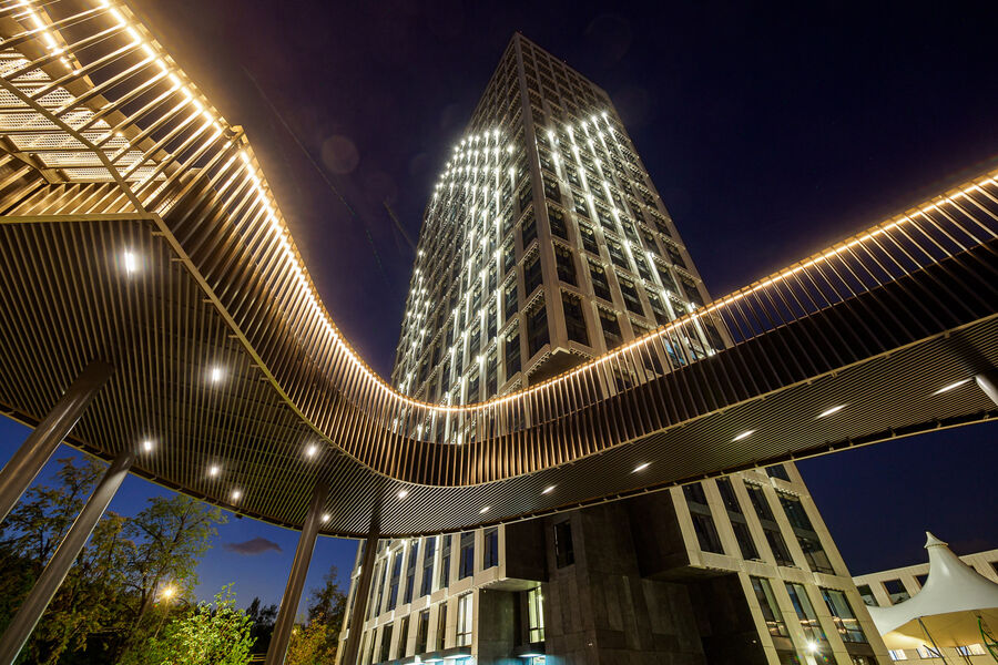 Подсветка фасадов жилых корпусов выполнена в форме березовых листьев – в вечернее и ночное время дома превращаются в настоящие светящиеся арт-объекты. Холодные огни корпусов эффектно контрастируют с теплым освещением на парящем мосту, во дворе, на детских и спортивных площадках.