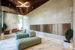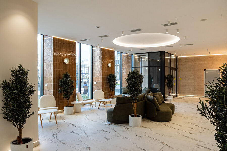 Природные мотивы прослеживаются и в отделке лобби – подъездами и даже парадными их трудно назвать. Разработкой дизайн-концепции общественных пространств занималась дизайн-студия Asthetique. Компания была основана в 2016 году архитектором Julien Albertini и дизайнером Alina Pimkina-Mehrle, и с тех пор завоевала множество международных наград за уникальный дизайн. В 2020 году команда Asthetique включена в десятку лучших мировых дизайнеров Wave of the Future 2020 по версии американского журнала Hospitality Design.