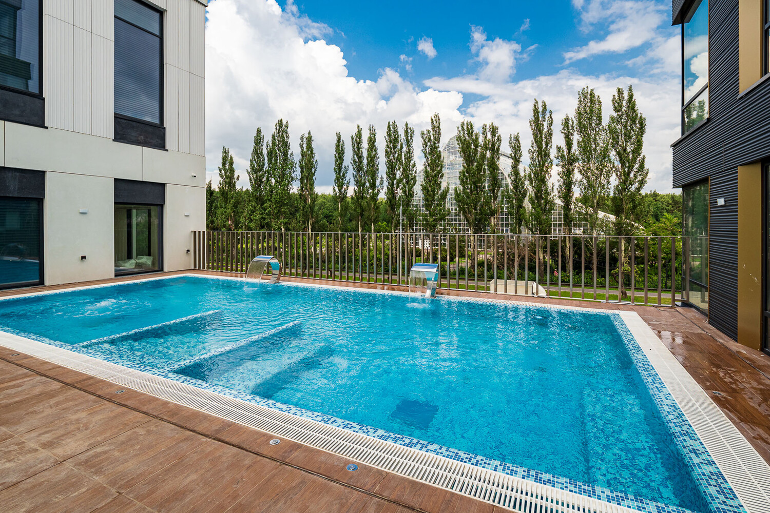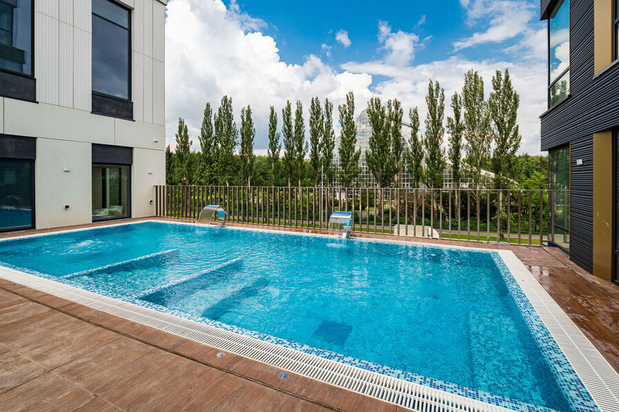 Главным украшением двора-парка стал необычный извивающийся мост-ручей длиной более 200 метров. Поручни и ограждения изящной и прочной конструкции выполнены из нержавеющей стали. Парящий мост уже стал визитной карточкой жилого комплекса – здесь очень приятно гулять и любоваться прекрасными видами на Ботанический сад и собственный парк VERY на Ботанической, а еще здесь есть… круглогодичный бассейн! Но об этом чуть ниже.