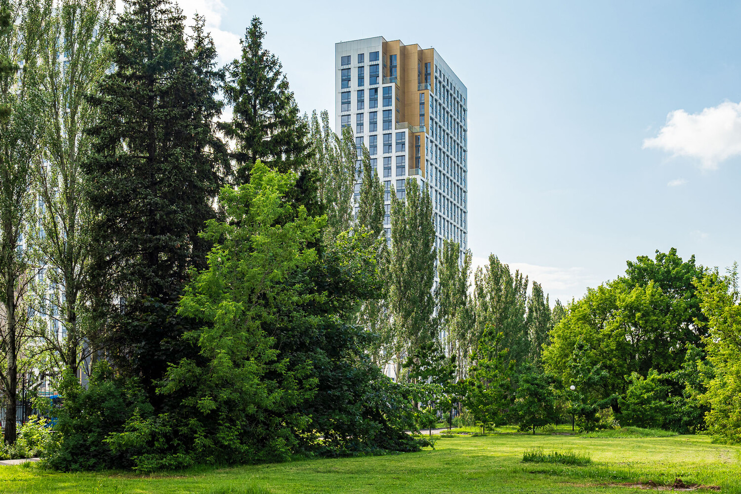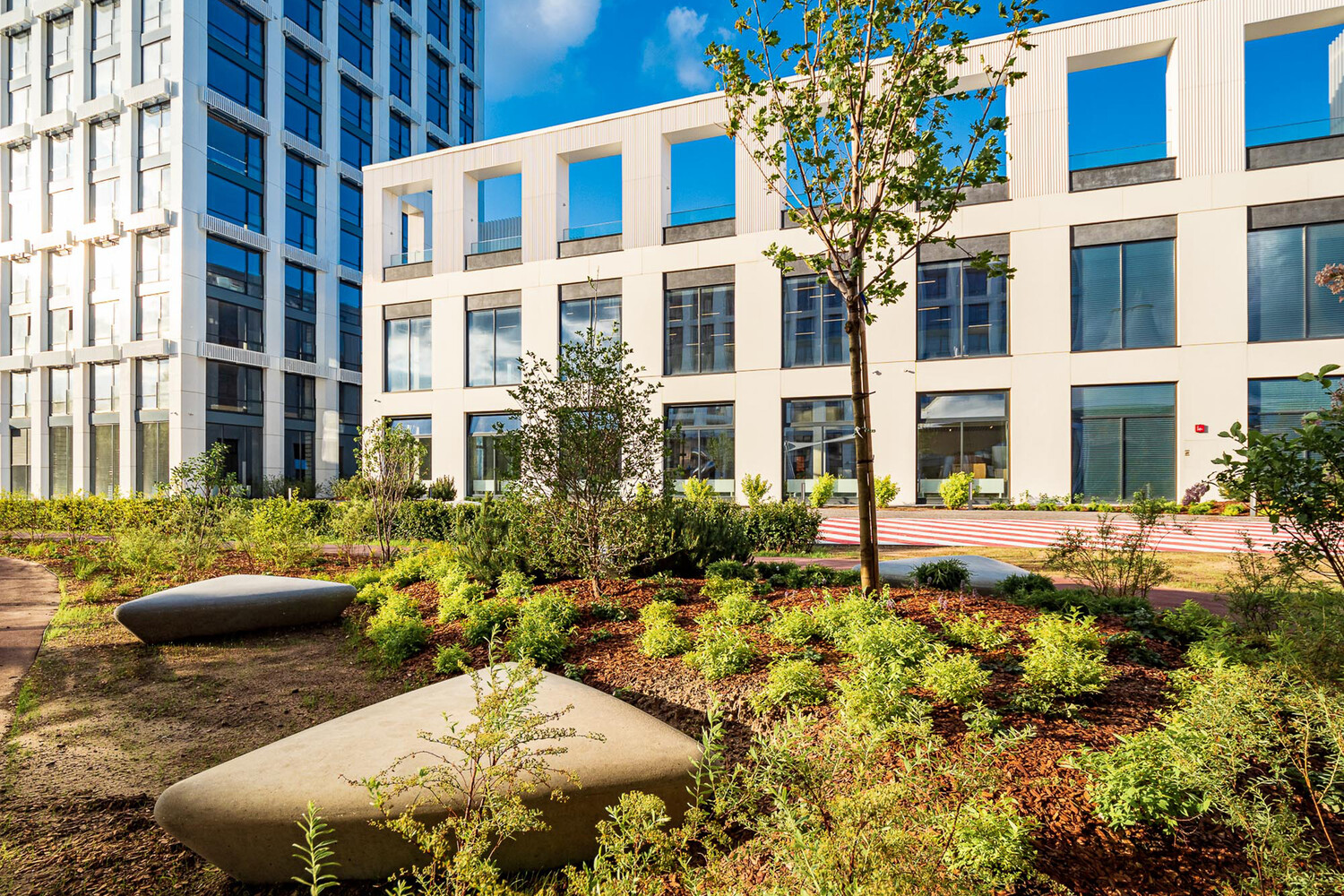 Сердце ЖК — большой зеленый двор-парк. В рамках первой очереди уже высажено более 1000 деревьев и кустарников, а общая площадь цветников и многолетних посадок составила 680 кв. метров. Здесь использован ярусный подход: от деревьев верхнего яруса, сформированного из характерных для нашей полосы берез, кленов, лип, до кустарников разной высоты и покрова тенелюбивых злаков и трав.