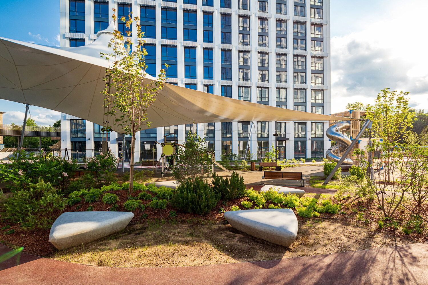 На территории первой очереди уже организована детская площадка с гигантским тентом, который позволяет защитить малышей от яркого солнца, дождя и снега. Площадь конструкции составляет 630 кв. м, что делает тент VERY на Ботанической одним из самых больших в России и Европе. При монтаже использовались металлоконструкции из монолитного основания, что обеспечивает его долговечность, надежность и безопасность.