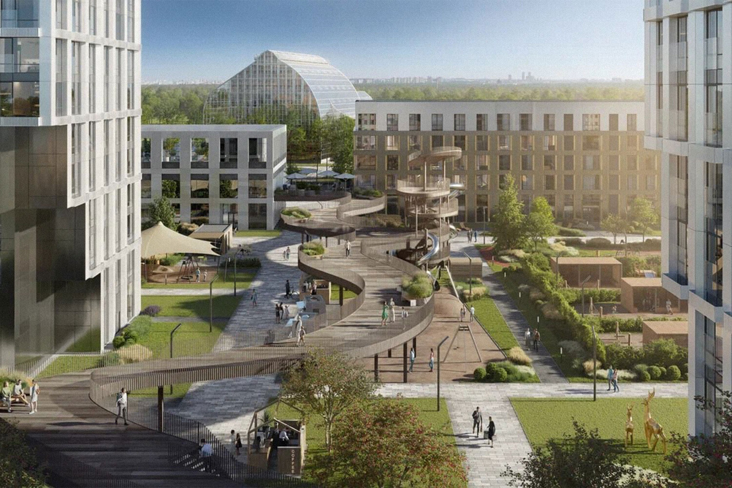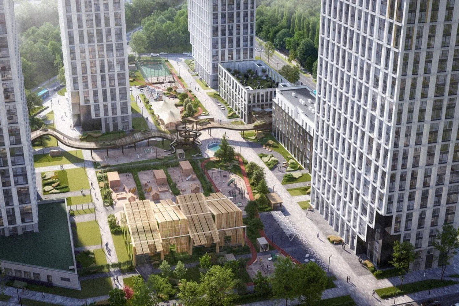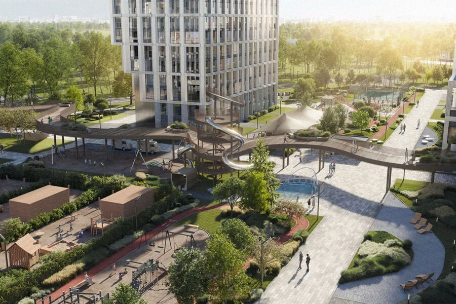 После завершения второй очереди на территории ЖК в общей сложности будет пять детских площадок, две спортивных площадки, включая крытую, и километровая велосипедная дорожка. На парящем мосту появится многоуровневая детская горка, а общая площадь игровых и спортивных площадок составит порядка 2500 кв. метров.