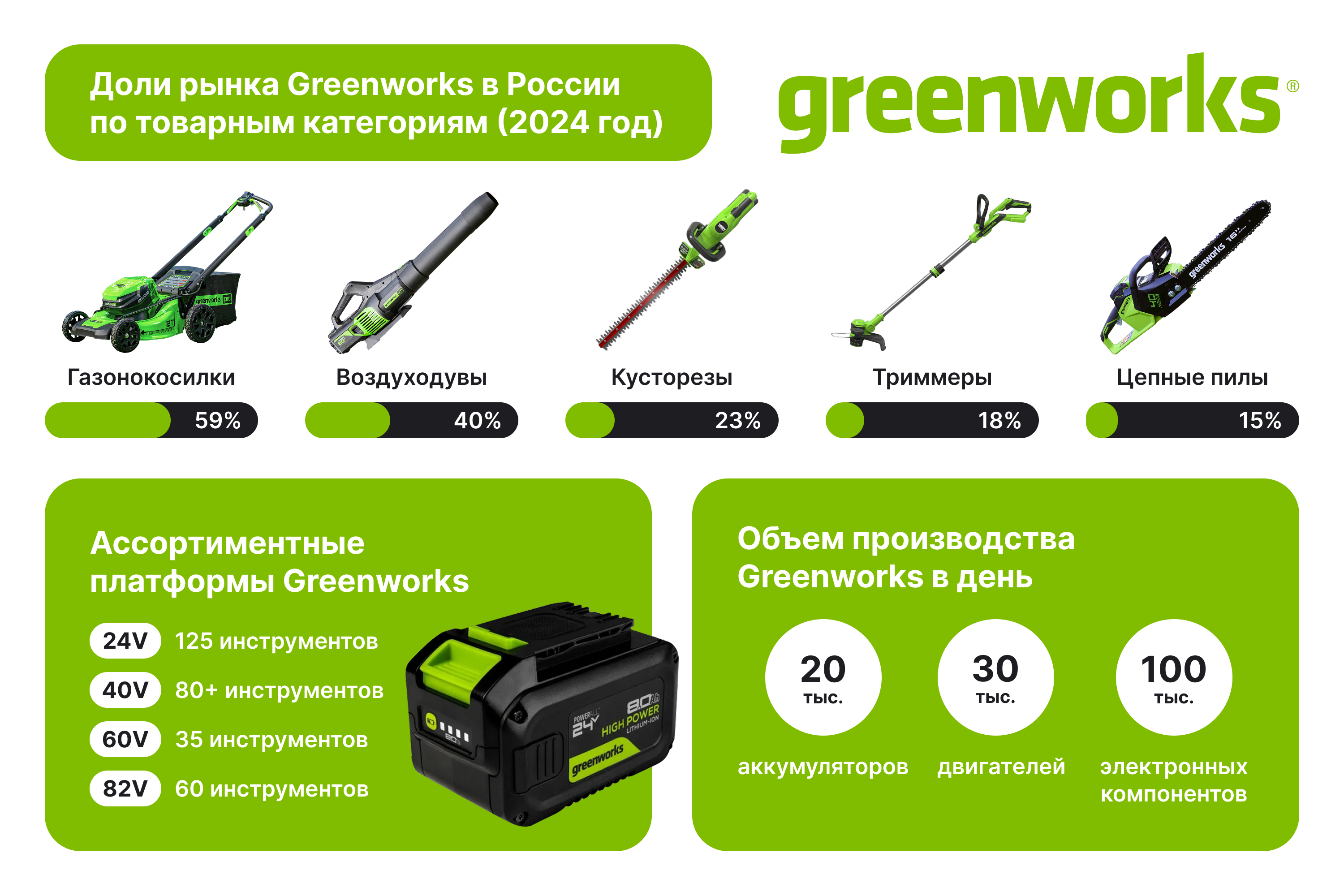 В 2024 году компания Greenworks занимала 20% рынка аккумуляторной садовой техники в России и лидирующие позиции во всех пяти ключевых товарных категориях. Особенно сильны позиции бренда в сегменте газонокосилок — здесь доля Greenworks составляет 59%.