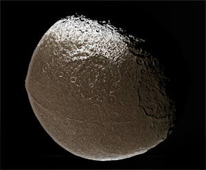 С остальными причудами сатурнианской луны астрономы были знакомы уже несколько веков. Орбита Япета — третьего по размеру после Титана и Реи спутника Сатурна — относительно круглая, однако наклонена к плоскости экватора материнской планеты, в которой примерно обращаются большинство других спутников, под углом в 15,5 градусов; плоскость орбиты покачивается — как говорят астрономы, прецессирует — с амплитудой около 7,5 градусов. Как правило, сильно наклоненные орбиты сильно вытянуты, поскольку речь в большинстве случаев идет о захваченных притяжением центрального тела астероидах, но опять-таки не в случае с Япетом. На спутнике, диаметр которого около 1,5 тысячи километров, расположены некоторые из крупнейших кратеров Солнечной системы, вероятно, ударного происхождения. У одного из них — диаметром в 500 км — необычно резкие края с обрывами высотой до 15 км.