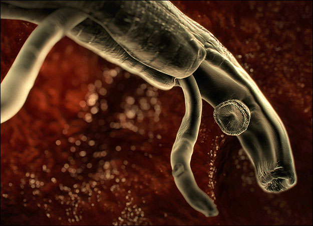 C точки зрения человека — окончательного хозяина кровяного сосальщика Schistosoma mansoni, облигатного паразита, вызывающего тропическое паразитарное заболевание кишечный шистосомоз — условия протекания его непростого жизненного цикла приятными никак не назовешь. Эти плоские черви из рода трематод откладывают яйца в фекалии прямо внутри кишечника, развиваются в личинки внутри улиток, затем, внедрившись в кожу человека, животных или птиц, через сосудистые русла проникают в венозные сплетения желудочно-кишечного тракта, где взрослеют, совокупляются и откладывают новую порцию яиц, которые снабжены шипами, способствующими выходу яйца из кровеносного русла внутрь кишечника.
